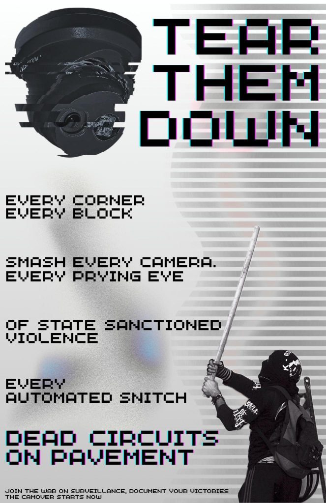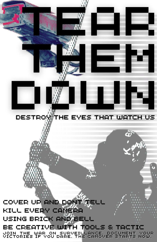 Fuck the eyes of the state, join for this season’s game of CamOver! In CamOver, you play a group of humans confronted with an invasion of cameras in your neighborhood. The struggle against the cameras is important, but your own survival is essential! To win you must form teams with friends in your neighborhood and destroy as many cameras as possible. The game starts the weekend of the 2025 Anarchist Tech Convergence and continues through to the end of November 2025. Be quick and move unseen, dead circuits on pavement. The neighborhood with the most points wins the game.